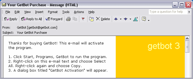 | Buy and Activate GetBot A GetBot activation e-mail contains purchase information and a cryptographic signature in plain text. Activating GetBot does not require downloading any additional software. No information is transmitted on the Internet when activating GetBot. If you change computers or format your hard drive, you can activate GetBot with your activation e-mail again. To upgrade GetBot, just download and run the new program file. Switching between versions doesn't loose GetBot options, activation, or the list of files to download. |